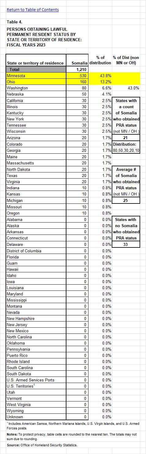 Somalia individuals, obtaining their Lawful Permanent Resident Alien (GREEN CARD) or (PRA) status (you don't need to leave the USA, after passing temporary status), listed by State or Territory of Residence, for Fiscal Year 2023. Refer to table below: