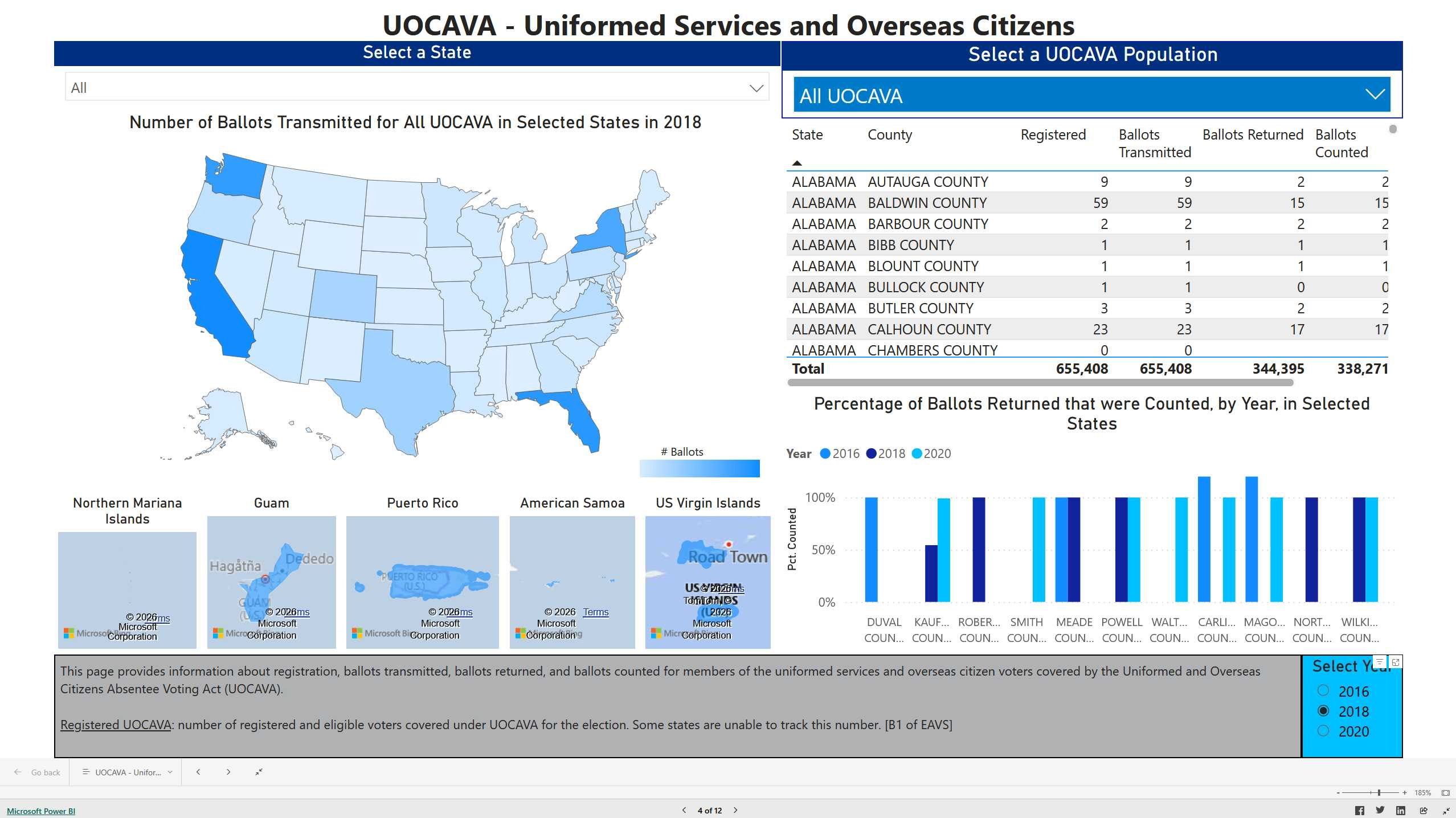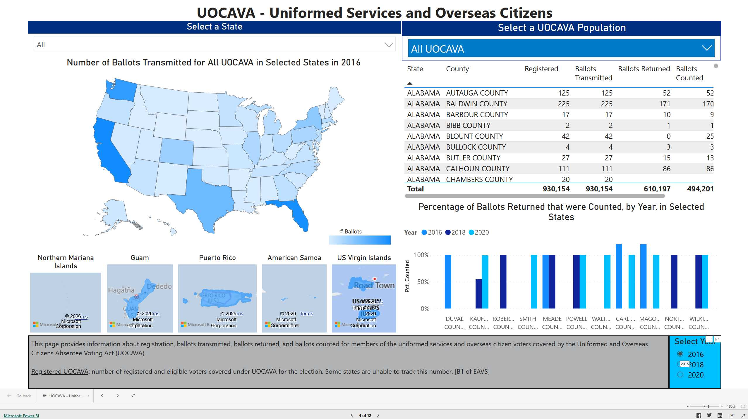Note the Ballots Returned column vs. Ballots Counted. How can you have more ballots counted versus those returned (to be counted, which should be a lower number, because of issues and deficiencies). (Multiple images: 2024, 2022, 2020, 2018, and 2016 of UOCAVA, which is military and overseas voting).