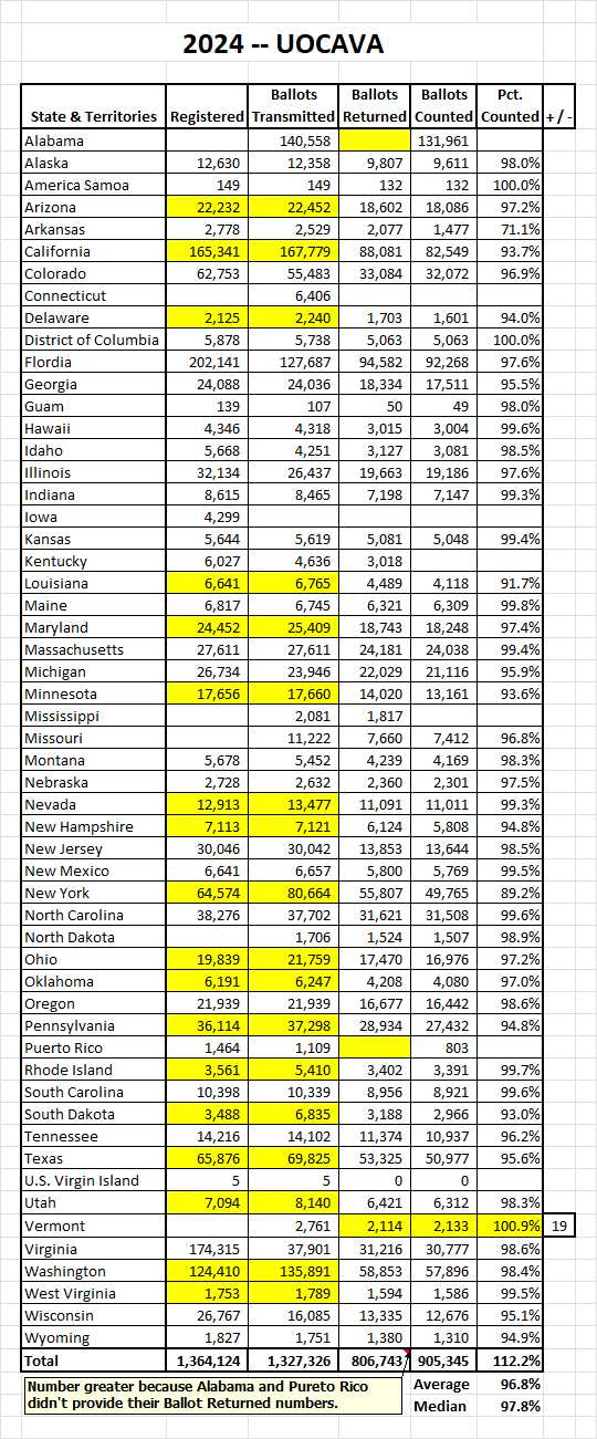 UOCAVA 2024 -- Incorrect Results occur (112.2% ballots counted), as result of Alabama and Puerto Rico not providing their Ballot Returned data. The Average count is 96.8%, with the Median of 97.8%. Only one state (Vermont) counted 19 more ballots (2,133), than were returned (2,114), for a rate of 100.9%.